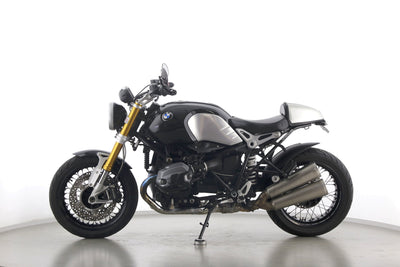 Eine BMW R nineT in gepflegtem Zustand u.a. mit Akrapovic-Doppel-Endschalldämpfer sowie kurzem Kennzeichenhalter.