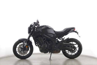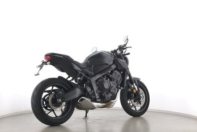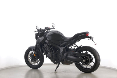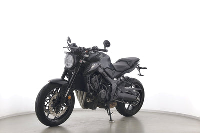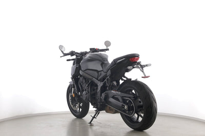 Eine scheckheftgepflegte Honda CB 650 R aus erster Hand in gepflegtem Zustand u.a. mit kurzem Kennzeichenhalter und LSL-Lenkerendenspiegeln.