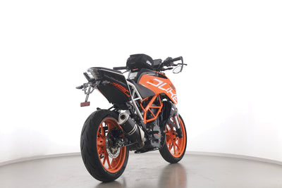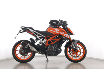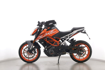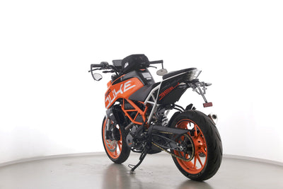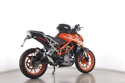 Eine scheckheftgepflegte KTM 390 Duke aus erster Hand in gepflegtem Zustand u.a. mit kurzem Kennzeichenhalter und KTM-Tankrucksack.