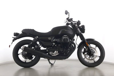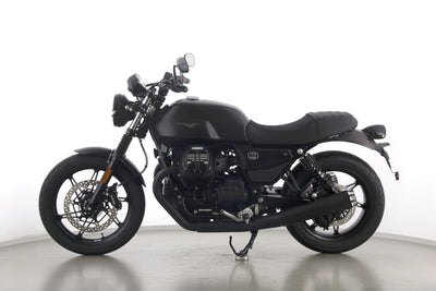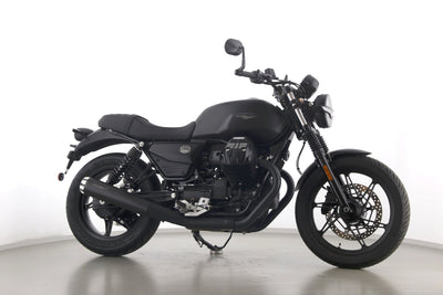 Eine Moto Guzzi V7 Stone als Neufahrzeug u.a. mit Mistral-Endschalldämpfer und Lenkerendenspiegeln.
