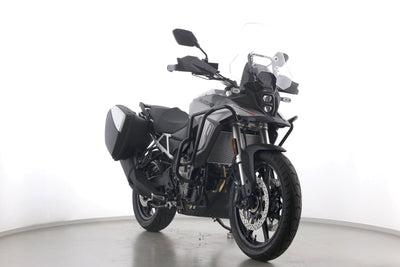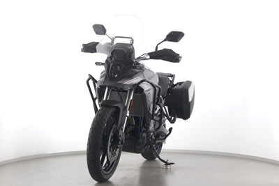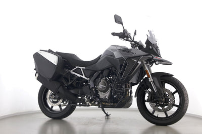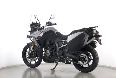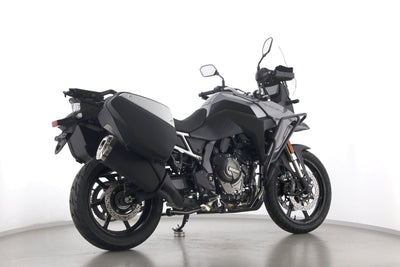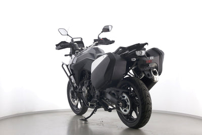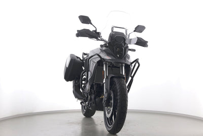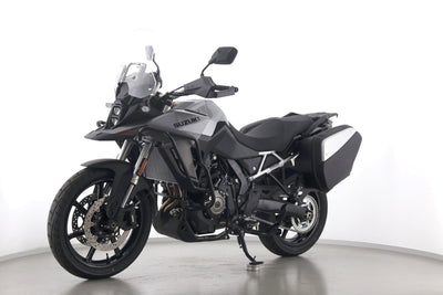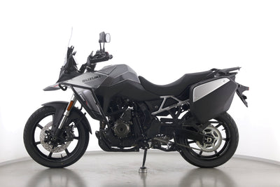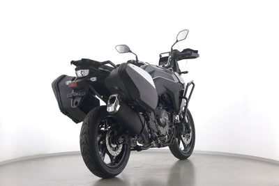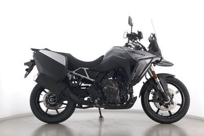 Eine Suzuki DL 800 V-Strom als Neufahrzeug u.a. mit Suzuki-Koffersystem gleichschließend sowie Sturzbügel in schwarz.