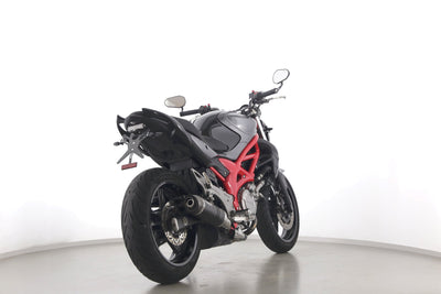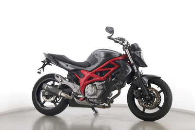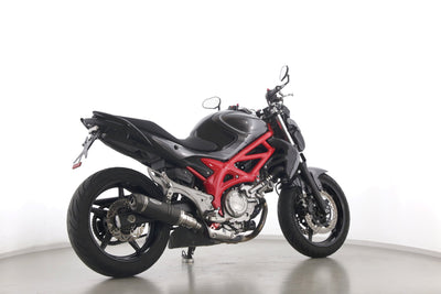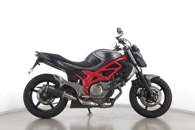 Eine scheckheftgepflegte Suzuki SFV 650 Gladius aus zweiter Hand in gepflegtem Zustand u.a. mit Tieferlegung und Shark-Carbon-Endschalldämpfer.