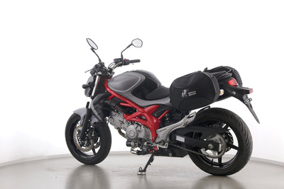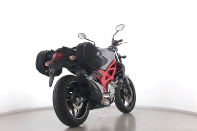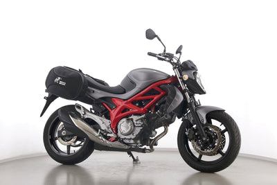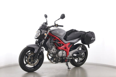 Eine Suzuki SFV 650 Gladius aus erster Hand in gebrauchtem Zustand mit Hepco & Becker-Packtaschensystem.