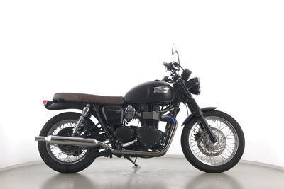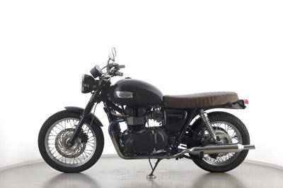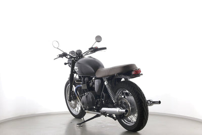 Eine Triumph Bonneville T100 in gepflegtem Zustand u.a. mit kurzem Kennzeichenhalter und Sonderlenker.