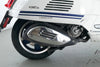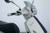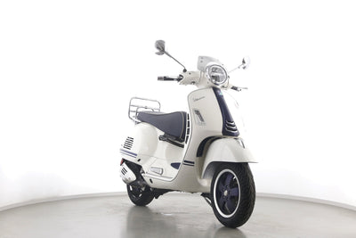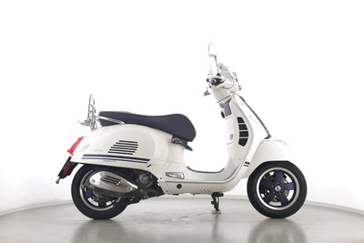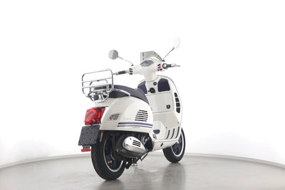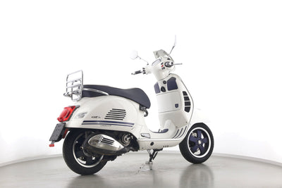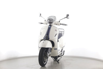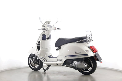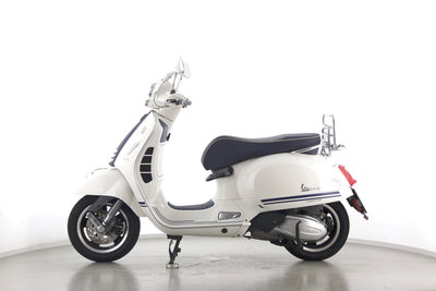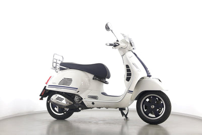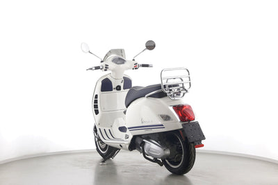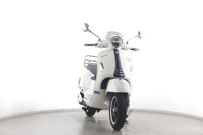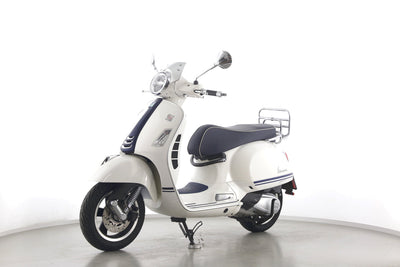 Eine Vespa GTS 300 aus zweiter Hand in gepflegtem Zustand u.a. als Yacht-Club Edition mit Chrom-Gepäckträger.